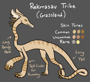 Rekrrasav are long and slender, able to sprint at incredible speeds on all fours. With long legs and necks, they can easily see over the tall grass, and their long tails help them make sharp turns when sprinting. Like desert fuglans, they are diurnal and lack bioluminescence. While they can stand on two legs, they usually prefer to walk on all fours or ride kariag mounts.